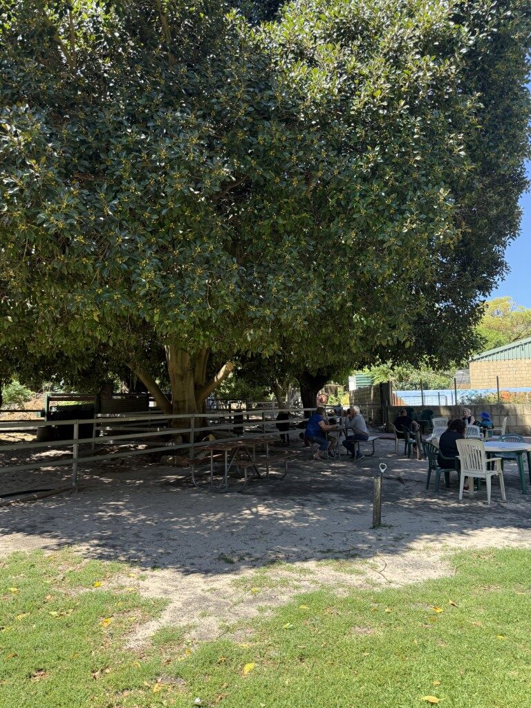 The grounds include a shaded outdoor rest area with seating beneath the trees, making it a pleasant spot to take a break or enjoy a simple picnic.