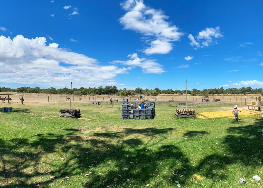 From the car park, kids will likely spot the animals straight away out in the paddocks, which really sets the tone for the visit. Thereโs plenty of grassed space and a relaxed, rustic feel. Picnic tables are scattered around the lawn, but thereโs no indoor seating, so itโs a good idea to bring a picnic rug in case the tables are full or youโd like to spread out a bit more on the grass.