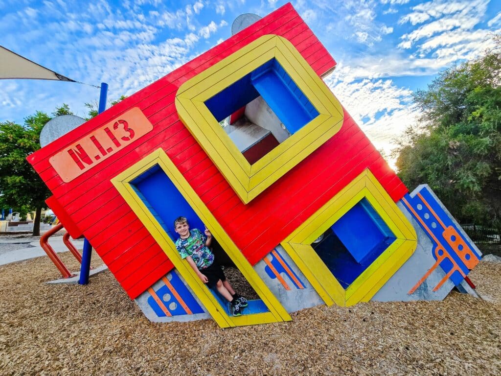 Bob Gordon Reserve Play Space is a fully fenced, UFO-themed Playground that recreates the iconic Leach Highway “spaceship” as an accessible Futuro House with interactive panels and play features inside. Around it, kids can enjoy a big tunnel slide, double flying fox with all-abilities seat, plenty of swings, monkey bars, spinners, seesaws and a space-themed water play zone. Toilets with baby change, BBQs, picnic shelters, shade and nearby fitness equipment make it an easy all-day family stop.