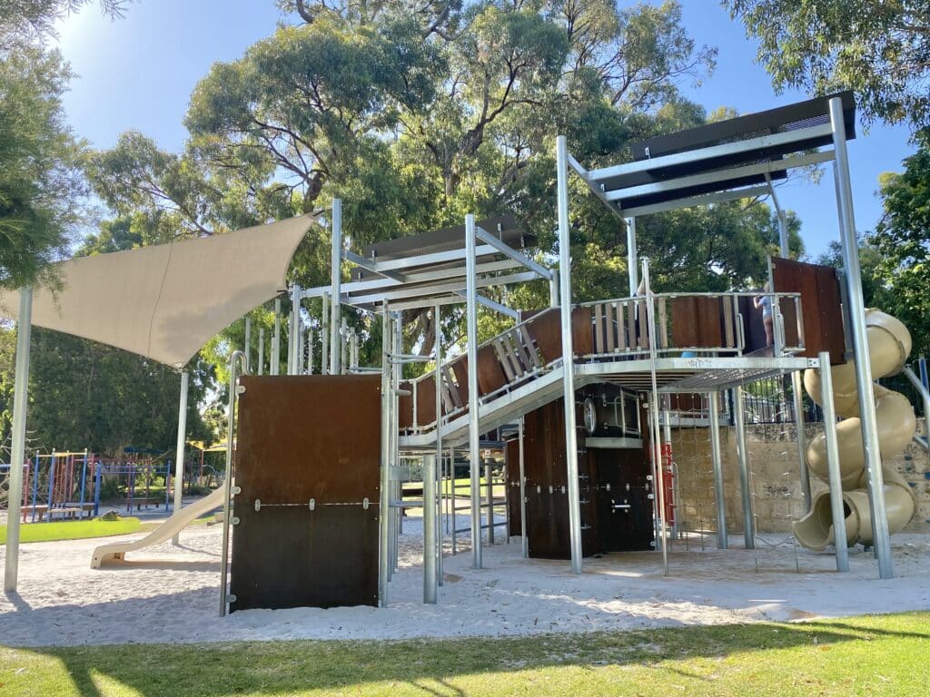 Perthโs newest innerโcity Playground, Wellington Square Playground, has a native banksia plant theme that can be spotted throughout the vast, vibrant play space. The colourful floating discs above the Playground not only provide shade, but also reflect the stars and sky from Dreamtime stories. This Playground has EVERYTHING โ water play, a scooter track, flying foxes, basketball, lots of climbing and swings, as well as huge slides. Itโs definitely one of the very best parks in Perth!