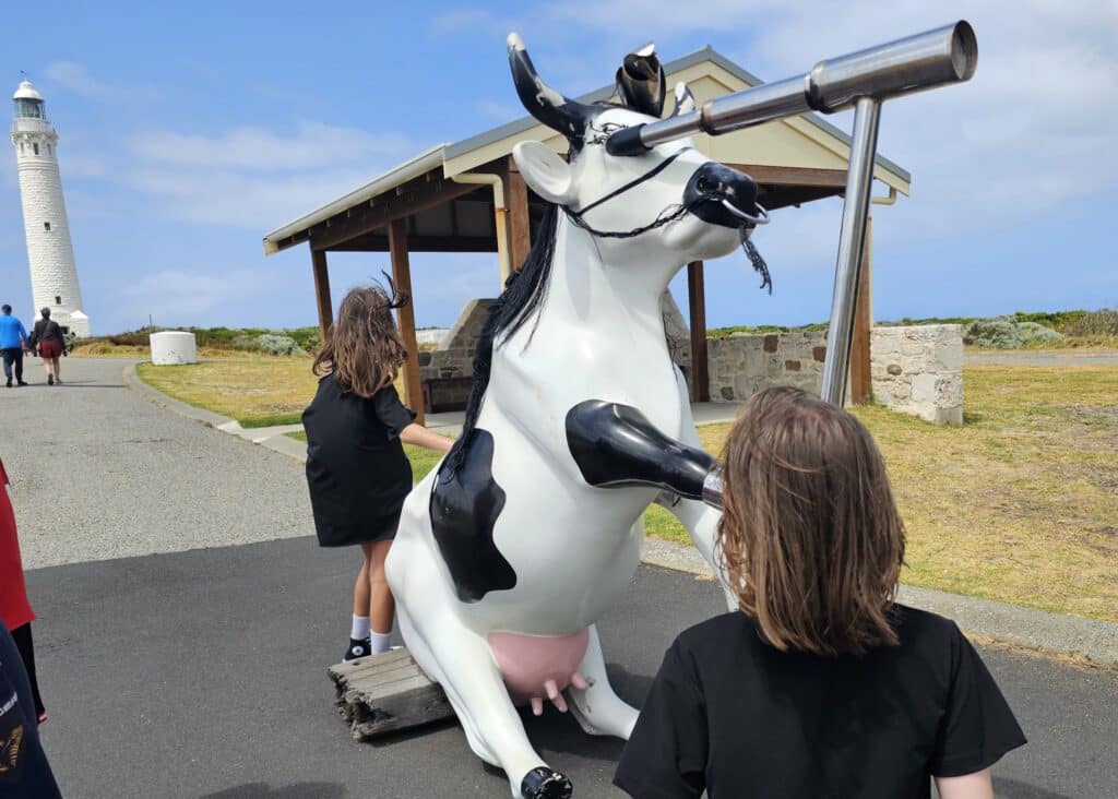 Your visit begins at the gift shop and Cape Leeuwin Cafรฉ. This is where you buy your tickets and use the toilets before heading up to the lighthouse. Itโs about a five-minute walk on a gentle incline to the base of the tower. Prams are fine for the paths and grounds, but they canโt go inside the lighthouse itself, so keep that in mind if youโre visiting with babies or toddlers. Be sure to say hi to the pirate cow too!