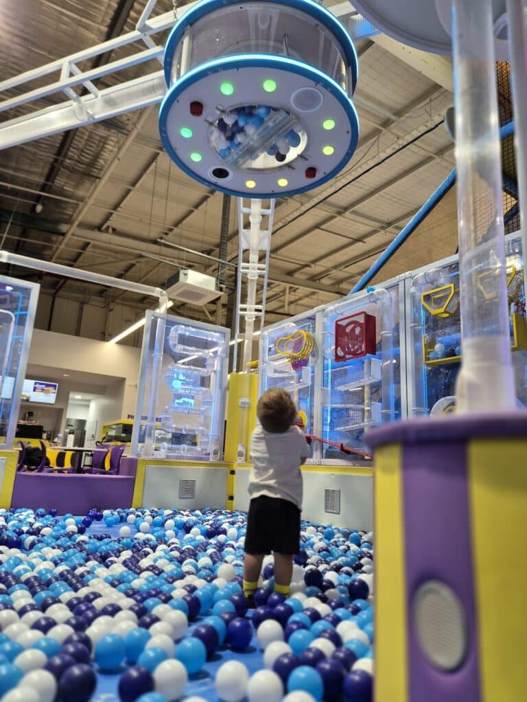A major drawcard for bigger kids is the 5–11 Slide Zone. This high-energy area features five different slides, enhanced with LED lighting to add to the excitement. There’s a mix of curly and straight slides plus a drop slide for thrill-seekers who love that rush of speed. It’s ideal for sensory seekers and kids who enjoy repetitive, fast-paced play, and because it’s zoned for the older age group, they can fully enjoy the experience without needing to dodge toddlers at the bottom.