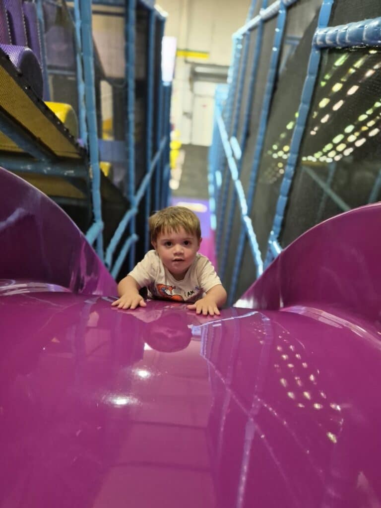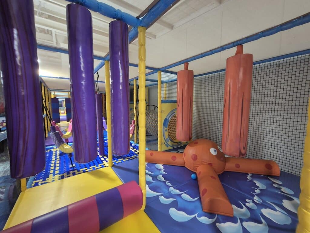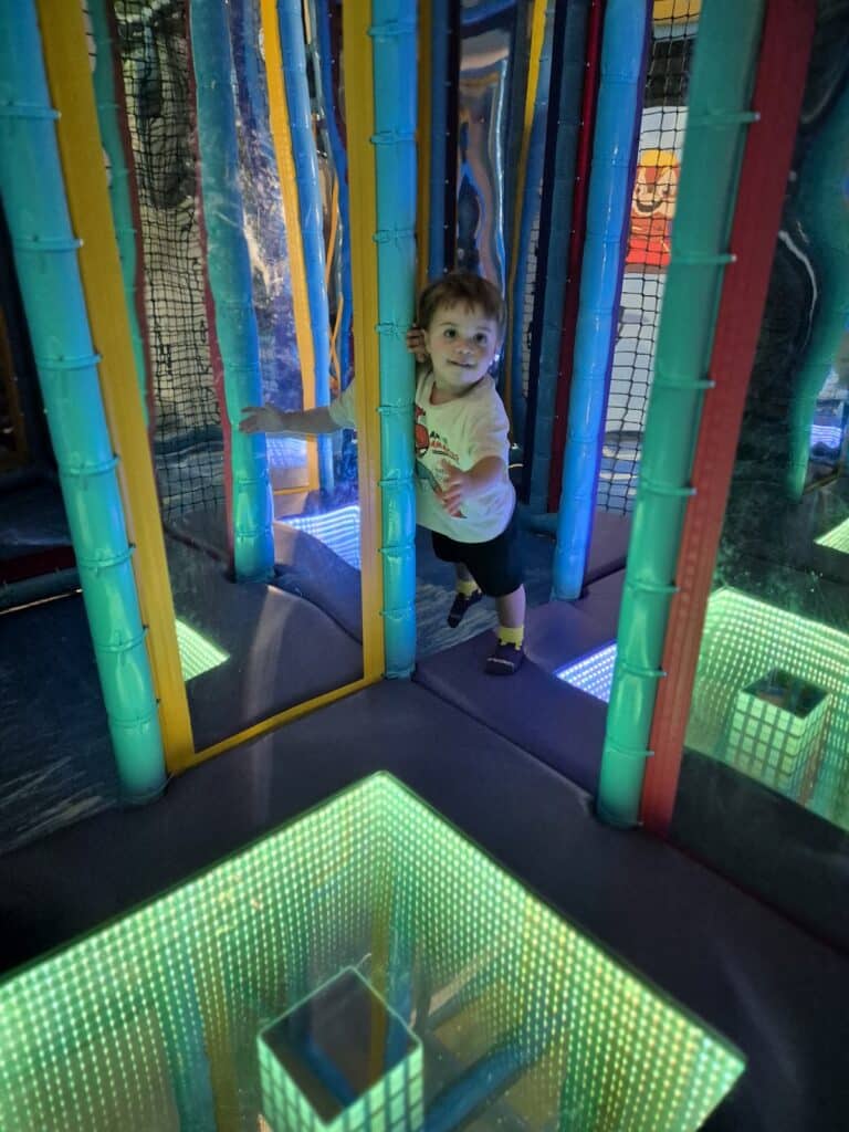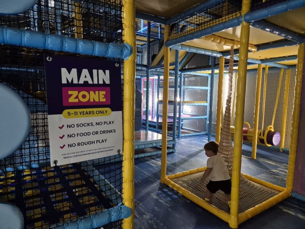For slightly older children, the 5–7 Main Zone ramps up the challenge. This multi-level structure offers dim lighting and mirror mazes for a bit of mystery, hidden slides to discover, balance beams, obstacle-style pathways and plenty of opportunities for climbing, swinging and scrambling.