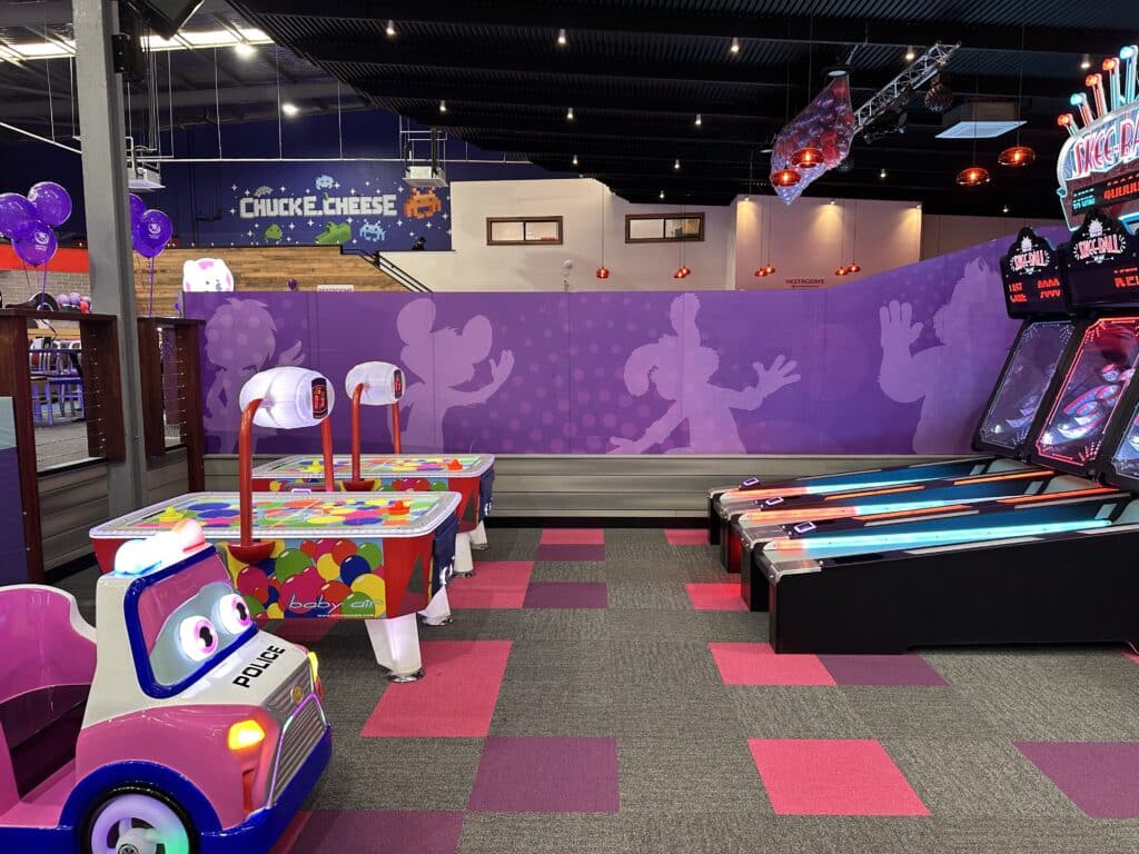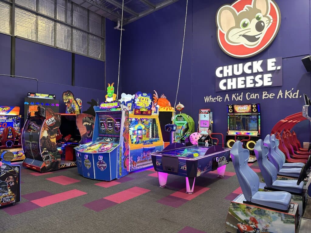 Bust a move on the light-up dance floor while Chuck E. & Friends appear on the mega screen โ itโs as fun for parents as it is for kids.