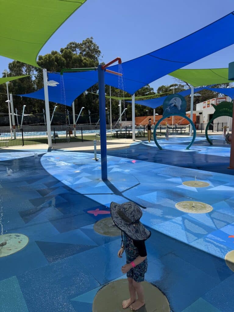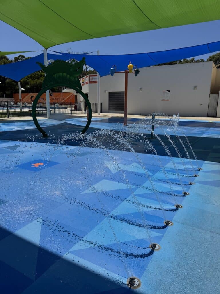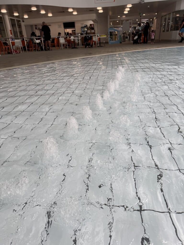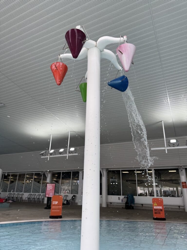 Much of the splash pad is shaded by sails, and there are benches along the windows and near the doors back to the indoor pools, so adults can sit close by while still staying out of the spray. Itโs worth keeping an eye on little feet for bees on warm days, as theyโre sometimes attracted to the puddles.
