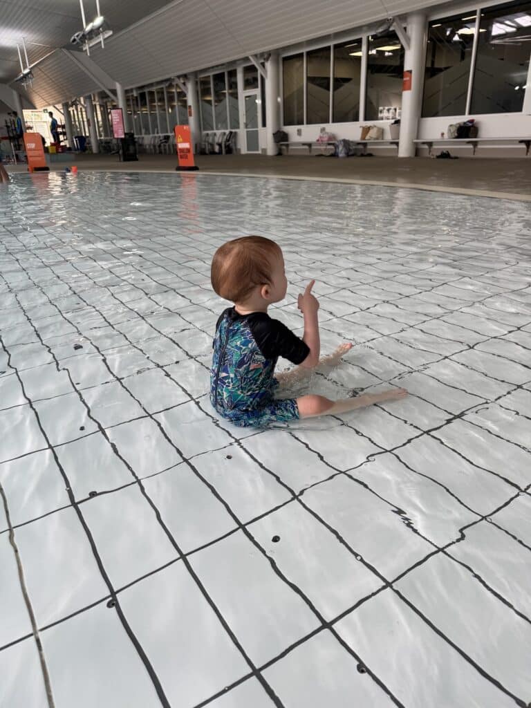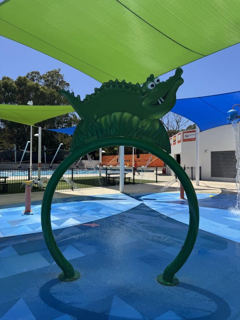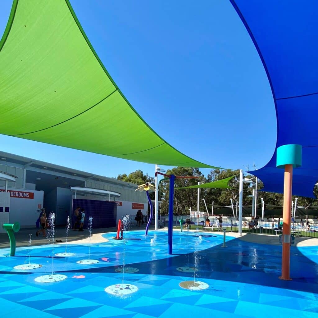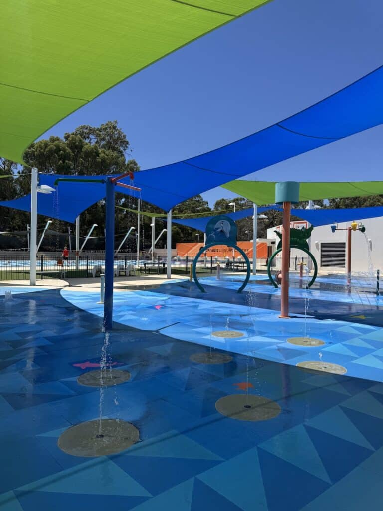 Much of the splash pad is shaded by sails, and there are benches along the windows and near the doors back to the indoor pools, so adults can sit close by while still staying out of the spray. Itโs worth keeping an eye on little feet for bees on warm days, as theyโre sometimes attracted to the puddles.