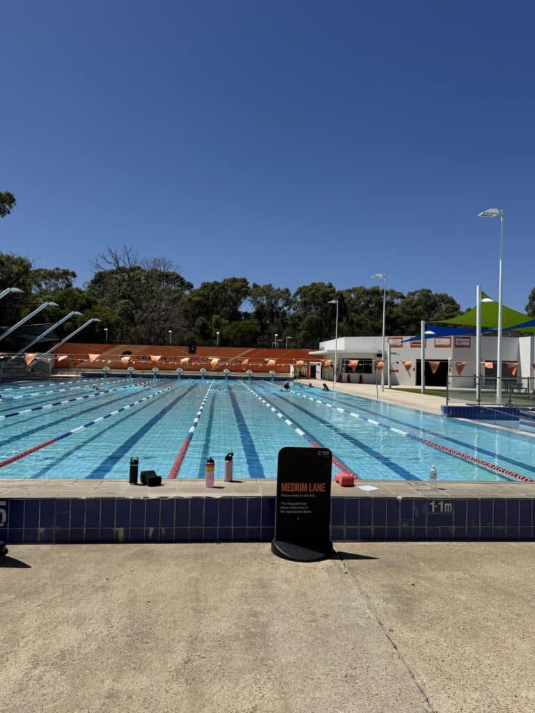 Beyond the splash pad is the 50โmetre outdoor lap pool, with a generous section available for confident swimmers and older kids.