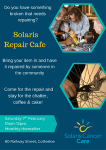 Commencing on Saturday, 7 February 2026 at 10am to12pm, and occurring the first Saturday of each month at Solaris Cancer Care – 80 Railway Street, Cottesloe. Items repaired, tea, coffee and cake by donation, chat, banter and good humour all free!