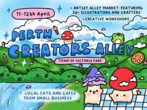 Perth Creators Alley is a vibrant weekend arts market and workshop series featuring digital illustrators, craft makers and creative small businesses. Curated by local artist Bizarre Blue, the program includes live digital art demonstrations, hands-on workshops introducing digital art as a career pathway, and sessions by guest artists in ceramics, polymer clay and floral crafts.