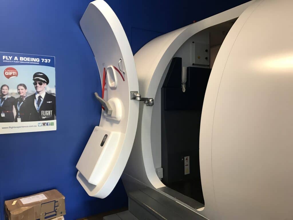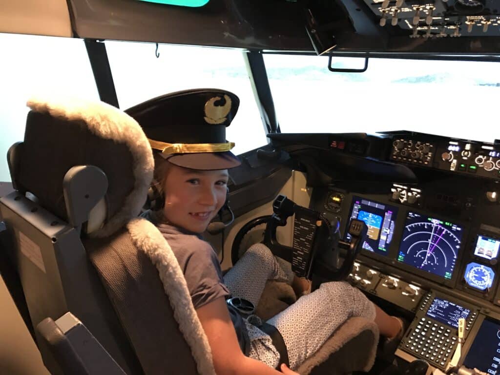 The simulator is a full-sized replica of a Boeing 737 cockpit, complete with all the buttons, switches and screens youโ€™d expect to see on the real flight deck. Once you step inside and the visuals fire up, it feels incredibly realistic. Youโ€™ll see the runway out front, the city or coastline below you and moving weather outside the windows. It doesnโ€™t go anywhere, of course, but the sense of movement and immersion is so convincing that parents prone to motion sickness might want to take it easy if theyโ€™ve got a particularly enthusiastic junior pilot at the controls!