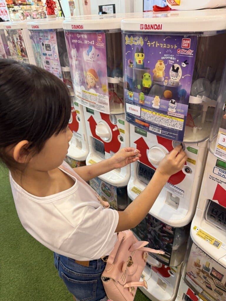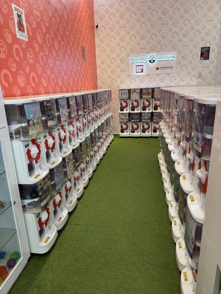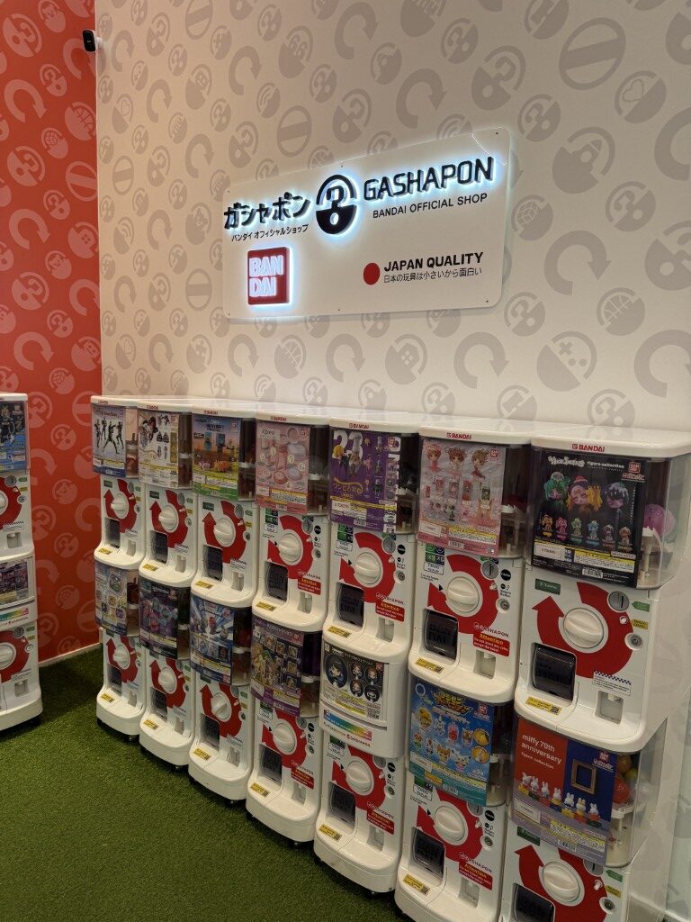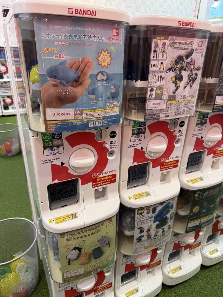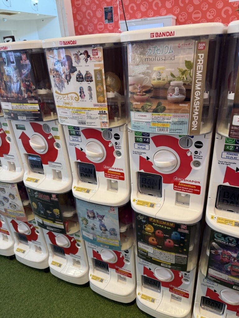 The shop itself feels very โ€œJapanese arcadeโ€: bright, clean and neatly organised. Machines are arranged in tidy rows so itโ€™s easy to browse and take your time choosing a series. There are over 100 capsule toy machines to pick from, covering a huge range of themes and fandoms.