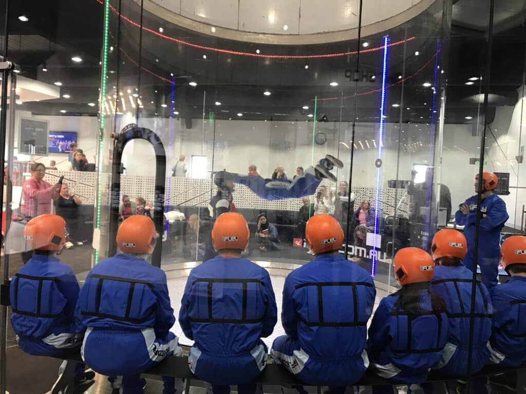 As you gain confidence, your instructor may offer the option of a โhigh flightโ upgrade, where they take you spinning higher up into the tunnel for a dramatic finish. This addโon costs extra and is completely optional, but many families say itโs the highlight of their session. Between flights, you sit on the bench next to the tunnel watching the rest of your group, cheering each other on and picking up tips.