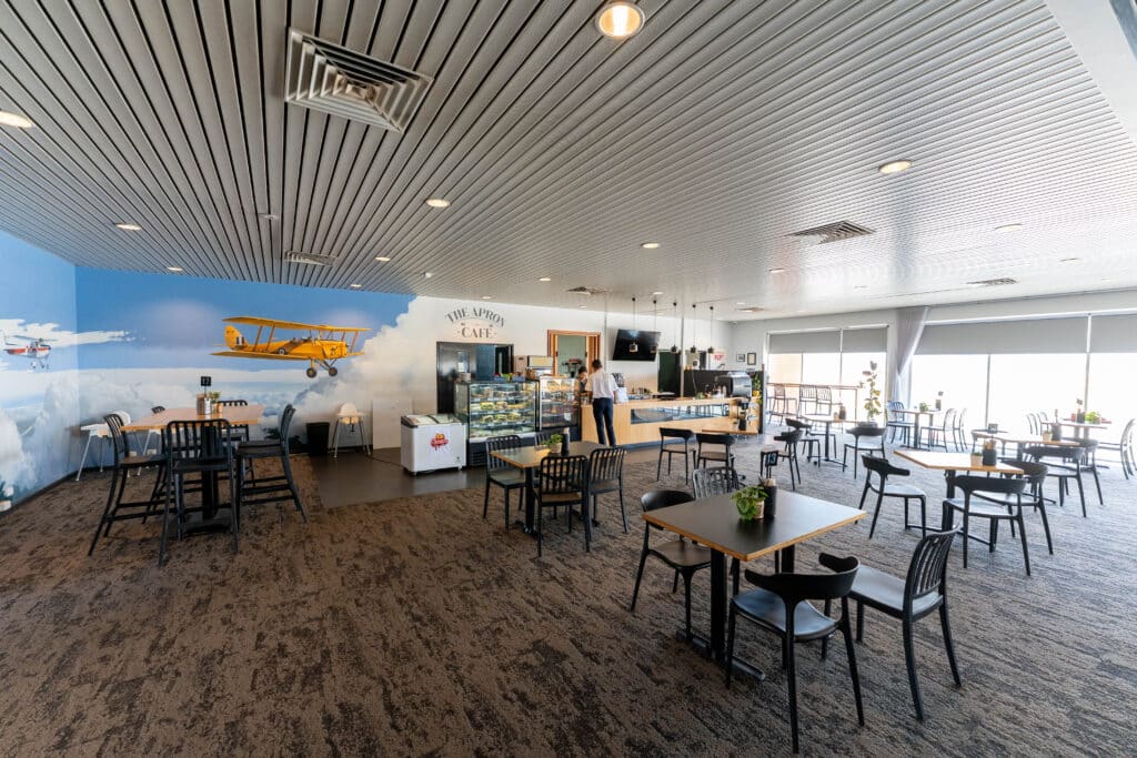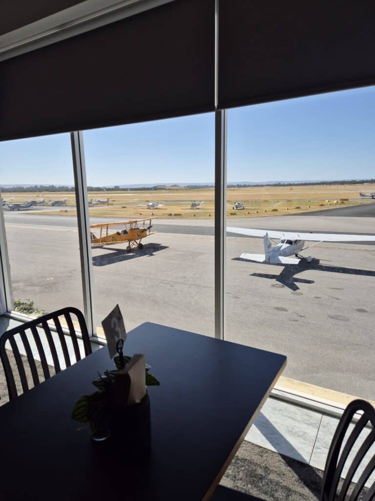 Perched above the Royal Aero Club of Western Australia, The Apron Cafรฉ offers a fantastic elevated view over the airfield.