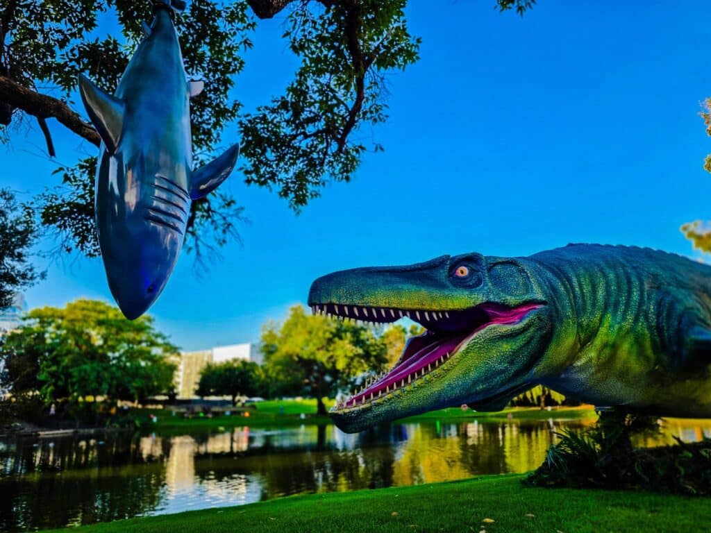From the moment you walk in, it feels like youโve stepped into another world. Towering dinosaurs surround you, moving, roaring and looking so lifelike that the kids were equal parts excited and slightly cautious. There are over 20 animatronic dinosaurs throughout the park, making every turn feel like a new prehistoric discovery.