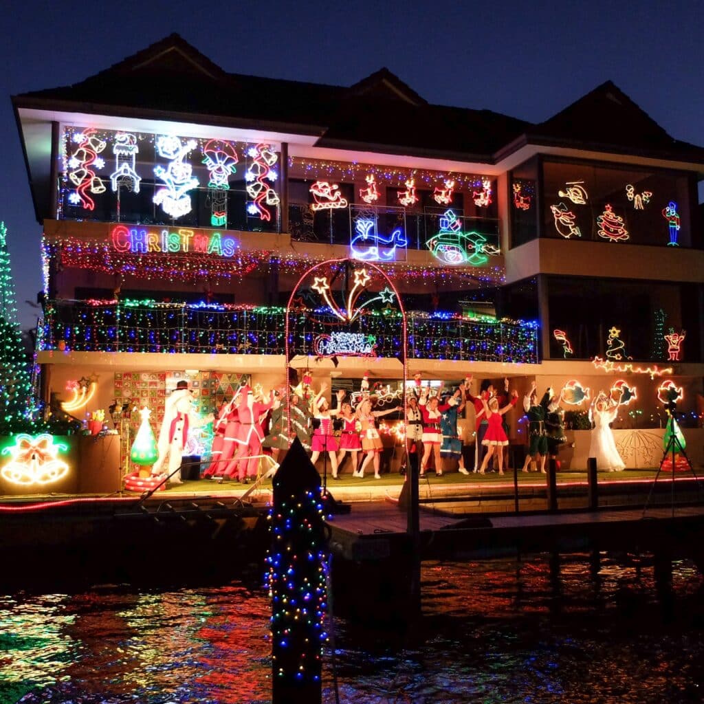 We cruised on the Mandjar last time and departed from the Mandurah Cruises Jetty in Mandjar Square (right in front of the Performing Arts Centre). Our boat played carols as we glided through the canals, and we could move around to take in the lights from different angles. Some houses really go all out with giant inflatables and dazzling displays—our daughter was wide-eyed the whole way and still talks about “the house with the big Santa!”
