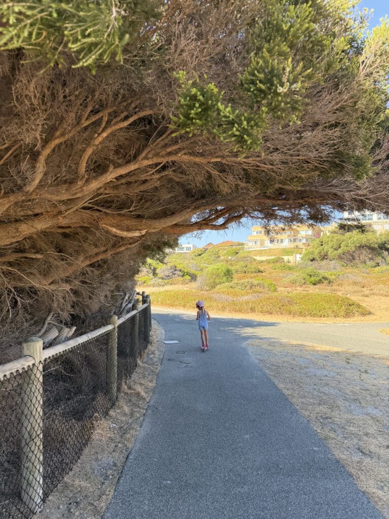 The Mindarie Foreshore Trail is a quieter northern suburbs coastal path that’s perfect for a pram walk with kids on scooters or bikes. Starting from the car park at Mindarie Keys Beach, the trail follows the limestone coastline north towards Quinns Rocks, with gentle gradients and minimal inclines that make it very manageable with a pram. The path is well paved and clearly marked, and you’ll enjoy views of Mindarie Marina, the open ocean and, on clear days, Rottnest Island in the distance. Interpretive signs along the route share information about local history, Noongar connections and the coastal environment, and there’s even a seabird nesting tower that sometimes hosts ospreys in breeding season. Read the Buggybuddys review of Mindarie Foreshore Trail.
