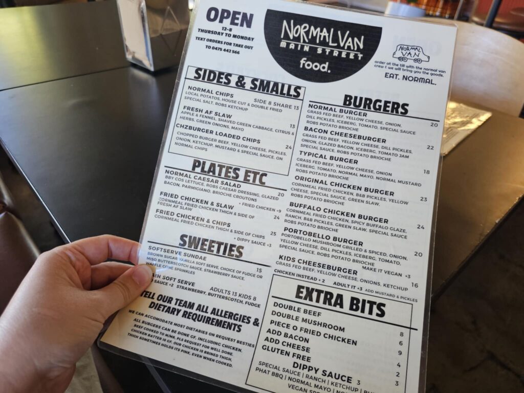Kids are covered, with a dedicated Normal Van Kids Cheeseburger with beef, cheese, ketchup, and onions on a brioche bun, plus an “adult it” option if you want to level it up with pickles and mustard. The girls both chose chips, which were generous serves and they could have shared one. For dessert, there’s a softserve sundae, that’s if you even have the tummy space. If you’re making it a holiday lunch or early evening bite, Normal Van also has a solid drinks list with cocktails like margaritas and an old fashioned for the grown-ups, plus beer and wine. For non-alcoholic “PG” options, there are nostalgic-style cans like root beer, cream soda, and cherry coke.