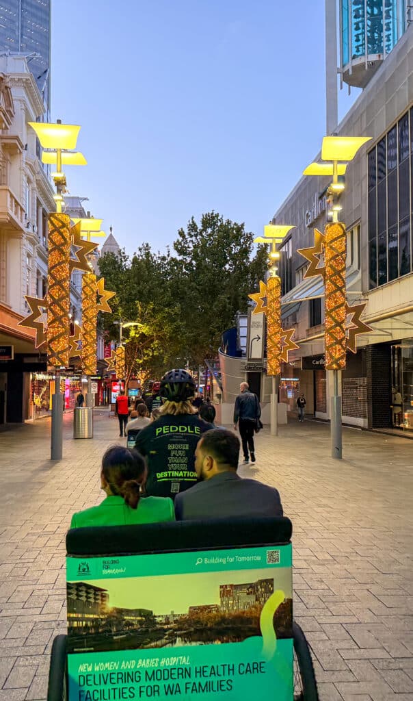 Peddle Perth’s Christmas Lights Tours are designed to be accessible and fun for the whole family. Each rickshaw can comfortably seat: