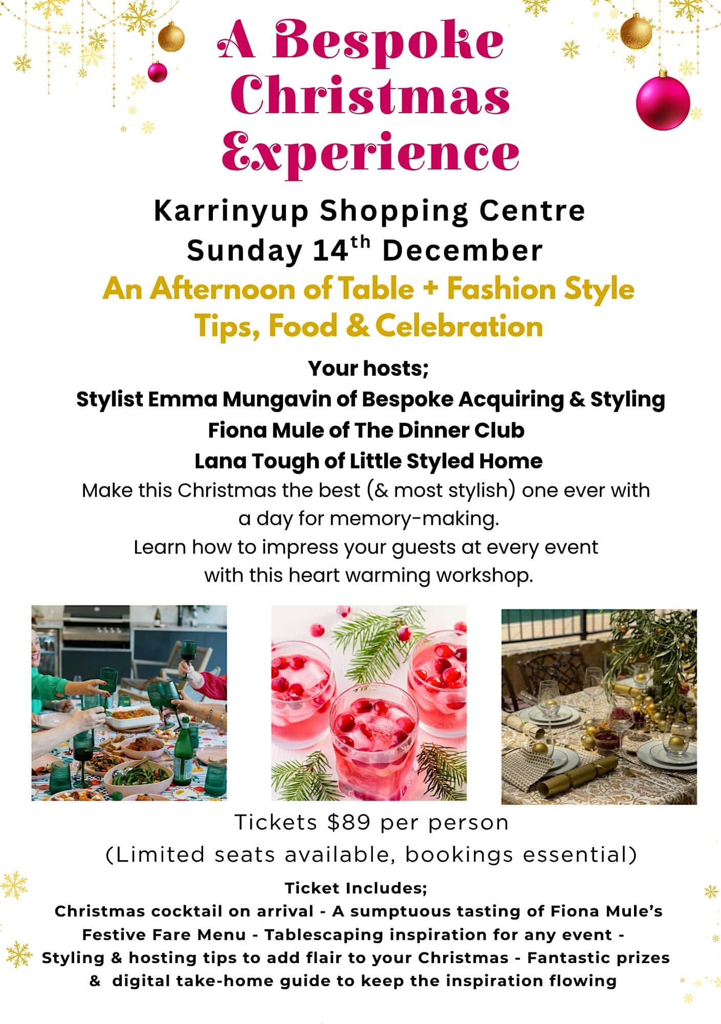 Hosted by Emma Mungavin of Bespoke Acquiring & Styling, together with Fiona Mule of The Dinner Planner and Lana Tough of Little Styled Home, this three-hour experience celebrates making this Christmas the best one ever — a day for memory-making, lingering around the table long after the food has been eaten, and creating new traditions while cherishing the ones that already exist.