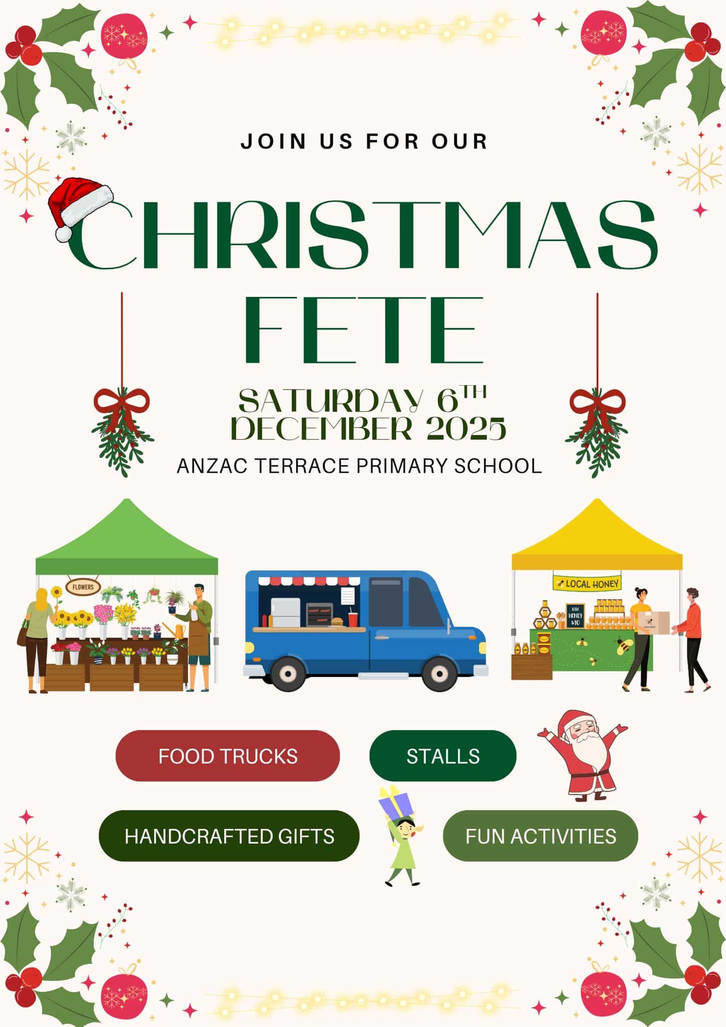 Anzac Terrace Primary School P&C is excited to invite our wonderful community to join us for a festive Christmas Fete full of fun, food, and holiday cheer!