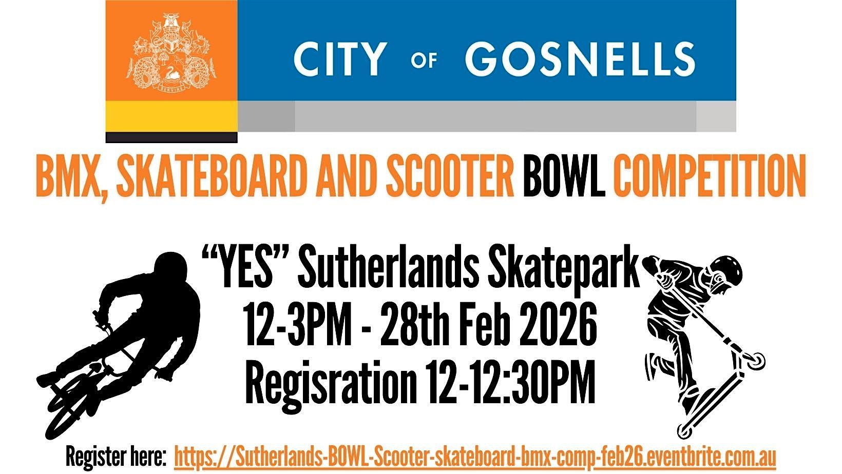 The City of Gosnells will be running a Skate, BMX and Scooter BOWL competition at the Sutherlands skatepark. A skatepark competition is a place for participants to showcase their skills and to demonstrate their growing skills to their friends, family, peers and the wider community. Skatepark competitions activate communities, help engage youth positively and involve community, parents, and beginner to advanced skatepark users.