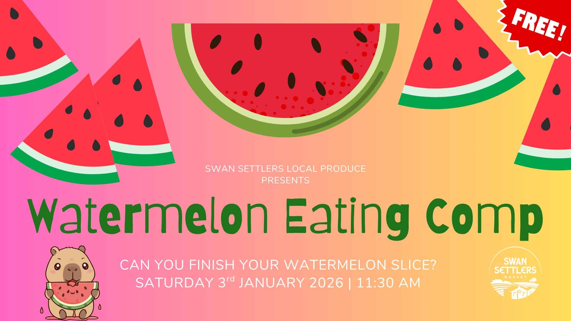 It’s back – and it’s going to be bigger, juicier, and messier than ever! Our *famous* Watermelon Eating Competition is returning to the Swan Settlers Market, and if you remember last time… it SOLD OUT fast! So grab your FREE spot before it’s gone!