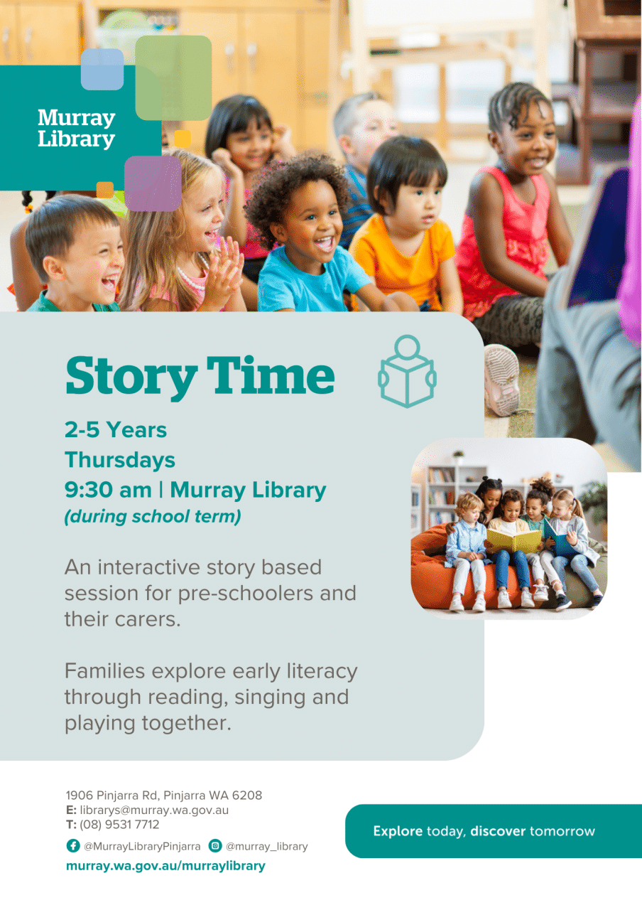 Murray Library 1906 Pinjarra Road, Pinjarra, WA, AustraliaJoin us at the Murray Library for an interactive story based session for pre-schoolers and their carers. Families and children explore early literacy and learning through reading, singing and playing together. *Please note Story Time only runs during the school term and takes a break during school holidays.