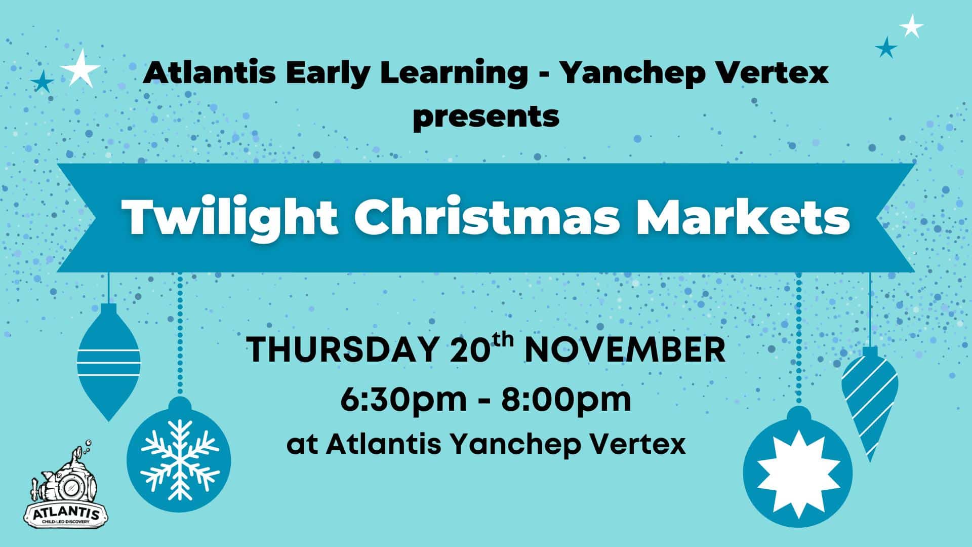 Atlantis Early Learning Yanchep 319 Castlemead Drive, YanchepCome along to Atlantis Early Learning Yanchep Vertex's annual Twilight Markets! We are excited to once again be hosting our annual Twilight Christmas Markets. Come along to support your local businesses and enjoy a fun filled evening.