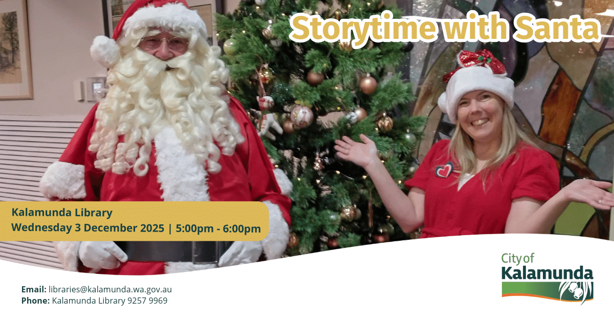 Kalamunda Library 7 Williams Street, Kalamunda, WA, AustraliaIn Kalamunda Library tradition, join us for a wonderful evening of songs, stories and craft, and a visit from Santa! Following stories and songs, families will have an opportunity to have photos taken with Santa. Suitable for children of all ages. Children must be accompanied by an adult. Tickets $5 per person plus booking fee. All adults and children in […]