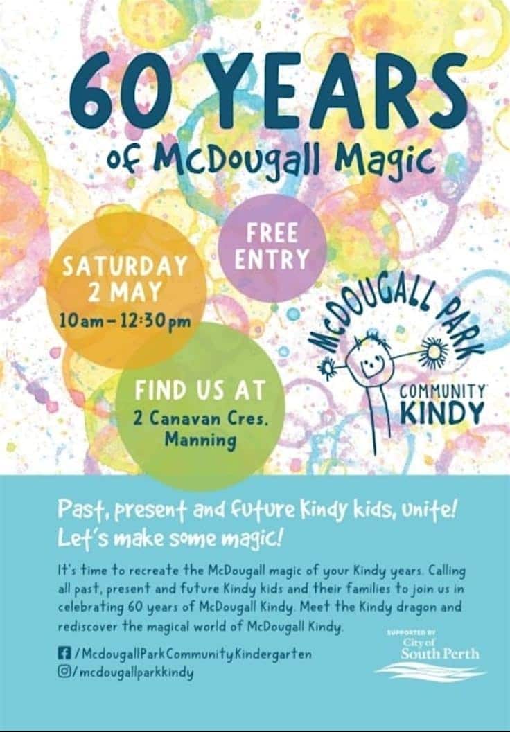 McDougall Park Community Kindy 2 Canavan Crescent, Manning, WA, AustraliaPast, present and future Kindy Kids - unite! Let's make some magic :-)It's time to recreate the McDougall magic of your kindy years. Calling all past, present and future Kindy kids and their families to join us in celebrating 60 years of McDougall Kindy. Meet the kindy dragon, craft ivy crowns and wands, get a magical picture at our photo […]
