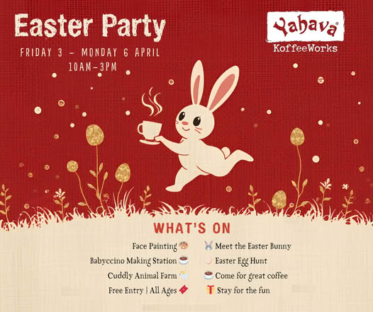 Yahava Koffeeworks Swan Valley 4752 West Swan Rd, West Swan, WA, AustraliaWe're throwing an EGG-cellent Easter Extravaganza at Yahava KoffeeWorks Swan Valley — and we want your whole crew there! From Friday 3rd to Monday 6th April, 10am–3pm each day, we've got four days of FREE family fun packed with: Easter Egg Hunts — multiple times daily Meet the Easter Bunny Face Painting Babyccino Making Station Cuddly Animal Farm […]