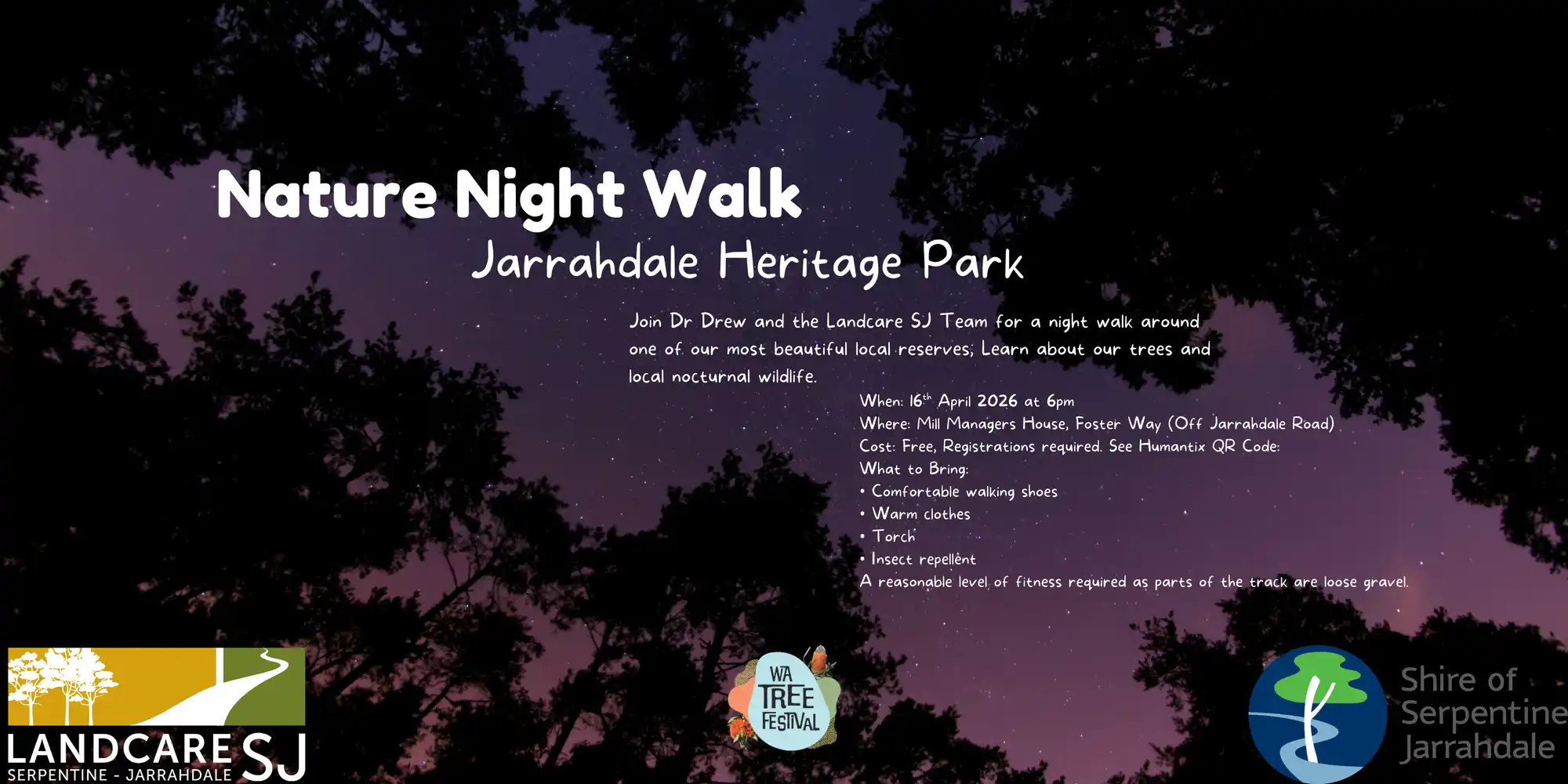 Dr Drew Batty from Landcare SJ will take you on a night walk around one of our most beautiful reserves. Learn about our native trees and the nocturnal wildlife they support. BYO torch. Register to attend: https://events.humanitix.com/nature-night-walk-jarrahdale-heritage-park
