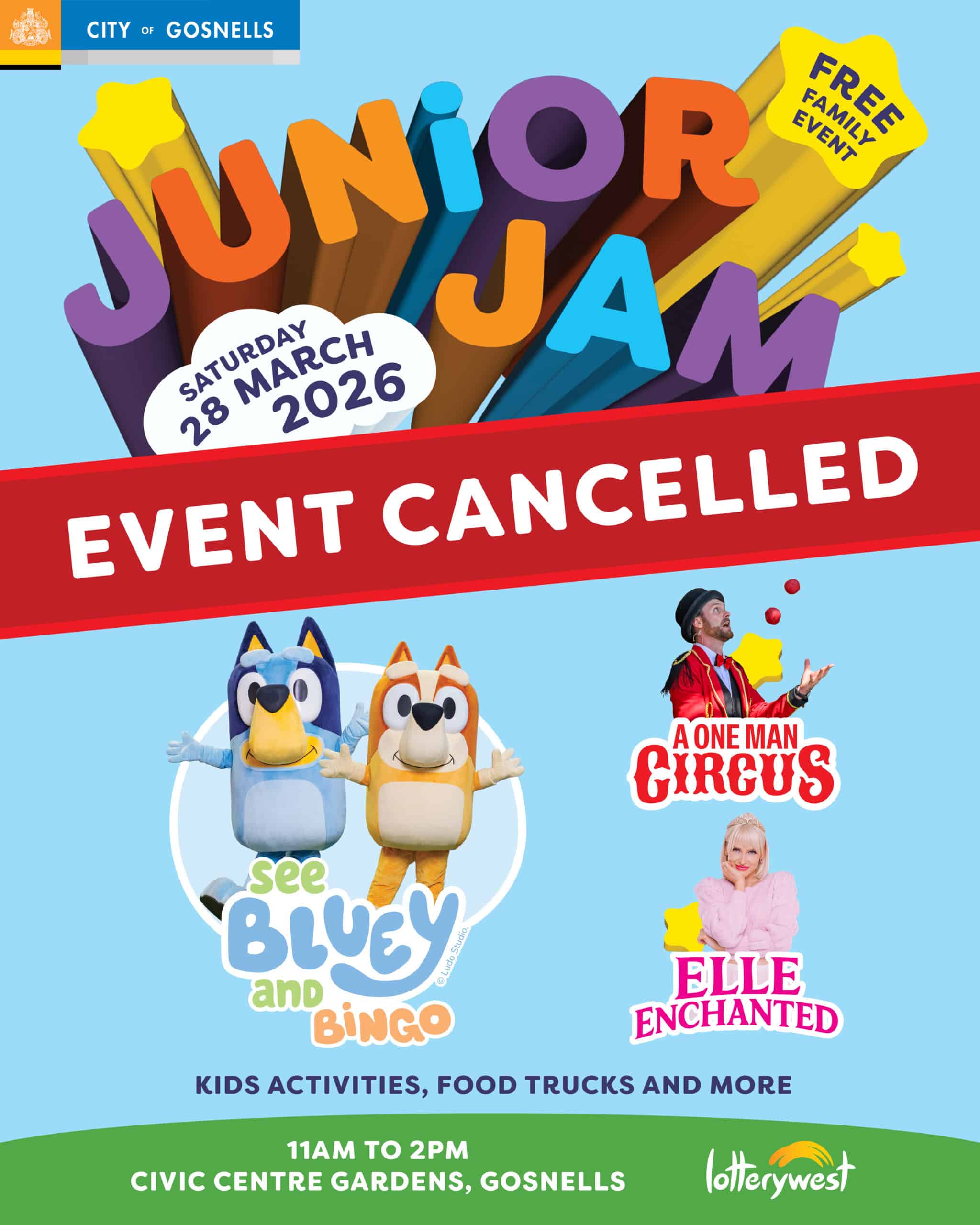 Civic Centre 215 Wright Street, Cloverdale, WA, AustraliaEvent Cancellation – Junior Jam The City of Gosnells has made the difficult decision to cancel Junior Jam, scheduled for this Saturday 28 March. Due to forecast extreme weather conditions, including strong winds and heavy rain, it is not possible to safely deliver the event. Many planned stage performances and activities cannot be set up or operated safely in these […]