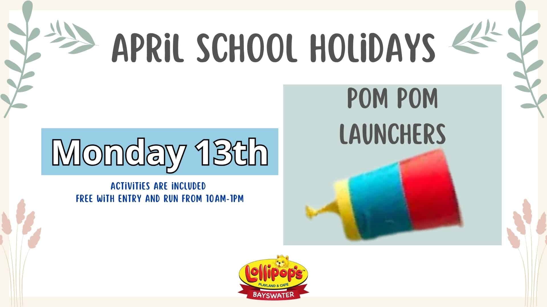 Lollipops Bayswater 68 Beechboro Rd Sth, Bayswater, WA, AustraliaReady, set, launch!Kids will make their own pom pom launchers and test them out for loads of giggles and fun. Ages 1-11, FREE with entry, 10am-1pm.Catch the action and share your photos!