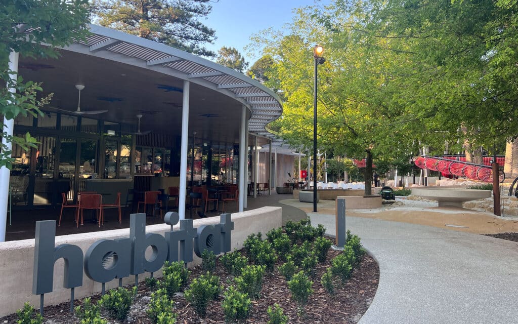 The adjacent Habitat cafรฉ offers food and drinks overlooking the Playground, making it a perfect spot for a break.