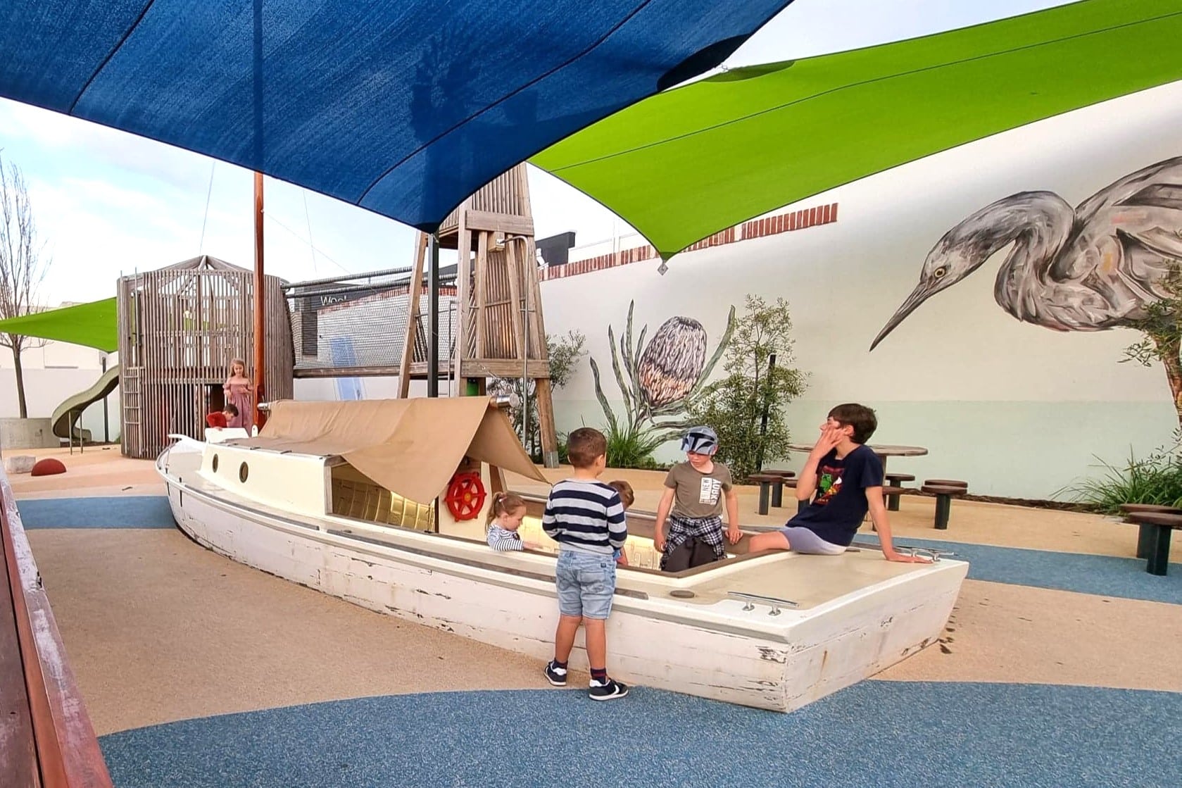 Railside Park sits right on South Western Highway and is perfect if everyone needs a proper run around. The big windmillโstyle slide is a standout for older kids, while younger ones are well catered for with a fully fenced and gated toddler area featuring a timber truck and mini slide. There is also an accessible merryโgoโround, water play via the Dethridge wheel creek, plus a pump track and skate park for scooters and bikes. With shade, BBQs, picnic spots and toilets, it is an easy, allโages play break just across from the town centre. Read the Buggybuddys review.