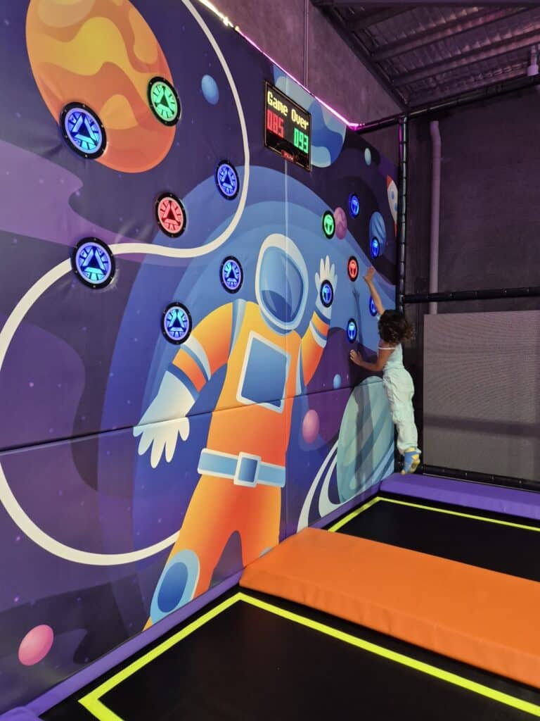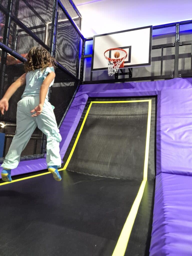The trampoline zone, designed for kids up to 12 years, includes basketball hoops and interactive game walls.