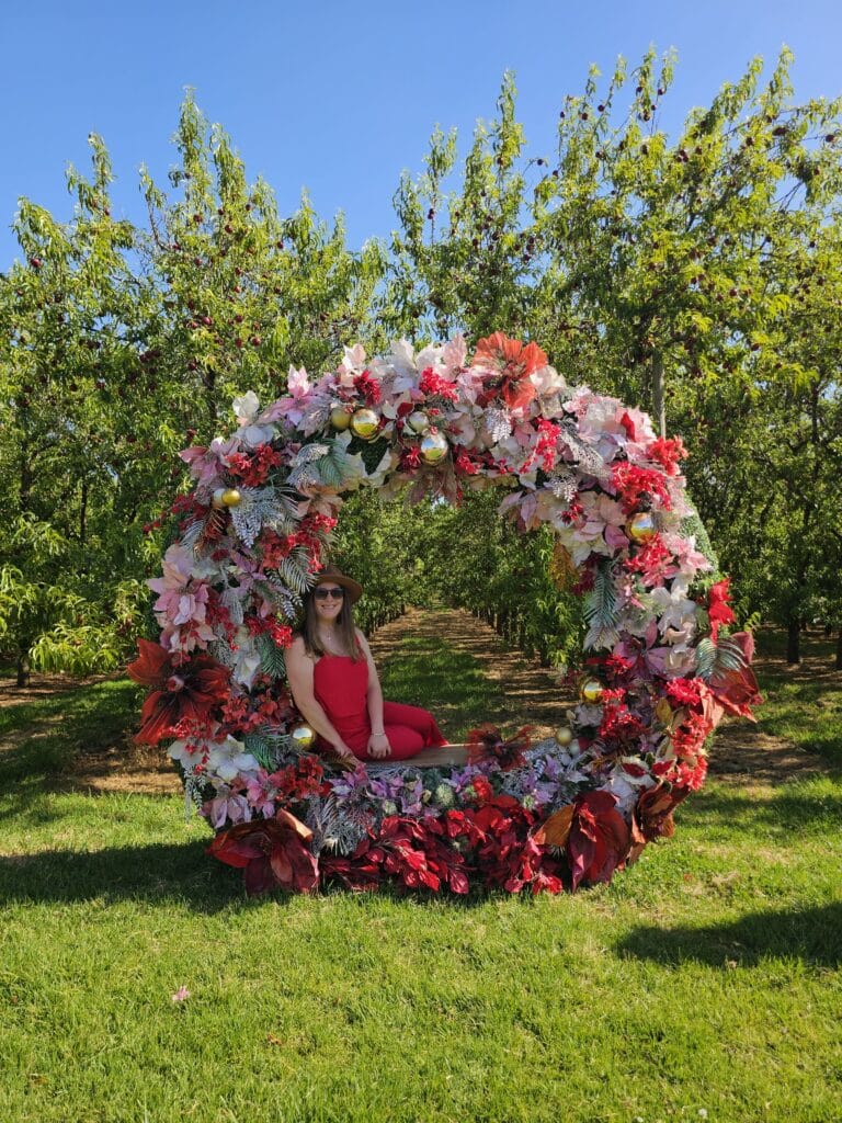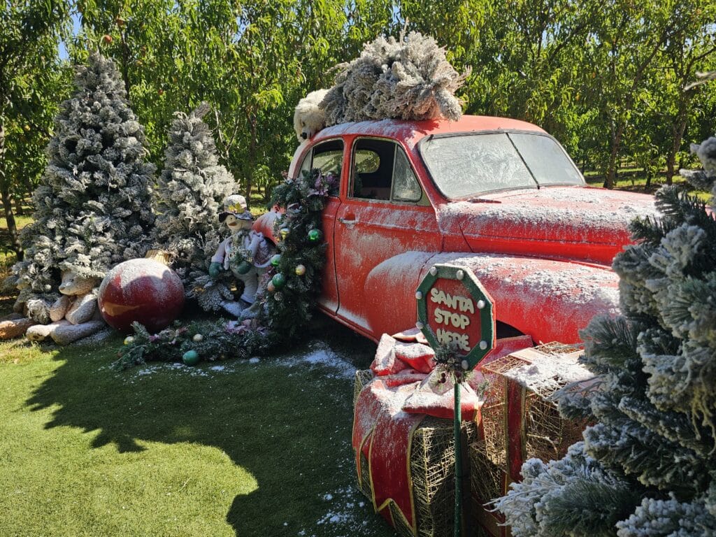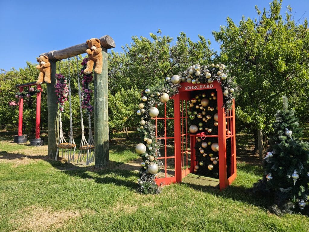 Plus, there’s a huge tree, giant baubles and more. With stunning photo props to admire and snap a photo – you may even find falling snow amongst the fruit trees.