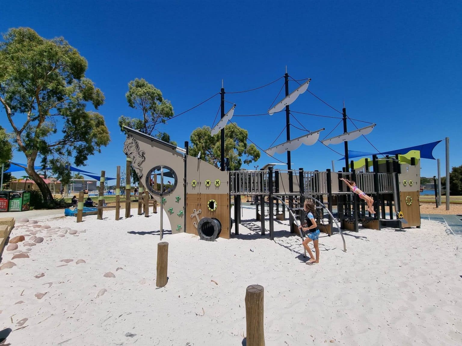 The main play structure offers plenty to climb, slide and explore. There are stairs, rope climbs and steep bridge-style ramps to tackle, plus a fireman’s pole and a small flying fox that’s always popular with older kids. Multiple slides give children different ways to whoosh back down, and there’s lots of opportunity for imaginative play as they steer the ship, lookout from different levels and role-play sea adventures. This part of the Playground will best suit confident toddlers through to primary school-aged children; little ones may need a helping hand with the steeper sections.