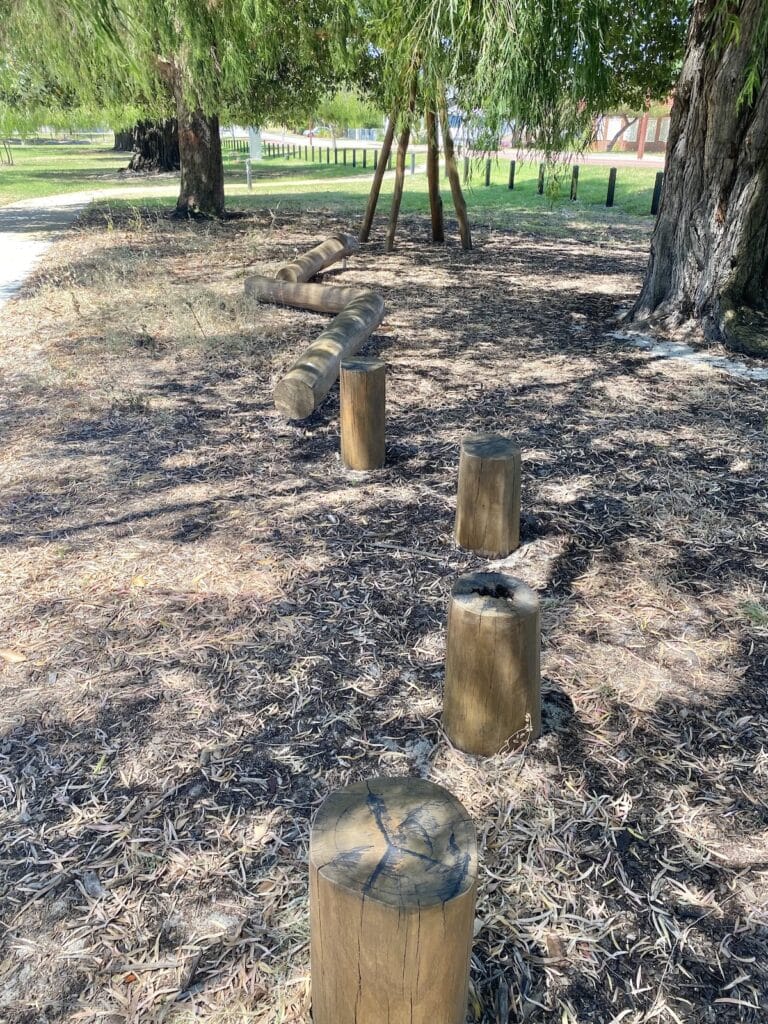 Younger children will enjoy the mini nature play nook tucked to one side of the park. Simple but effective, this area features wooden beams and stepping logs set into mulch, giving toddlers and preschoolers a safe spot to practice balancing, hopping, and climbing. It offers a gentle introduction to nature play without being too challenging for little legs.
