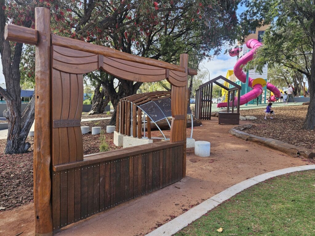 There’s also a wooden nature play area under the shady trees, with more imaginative play in the form of a cubby, hut and theatre/shop front.