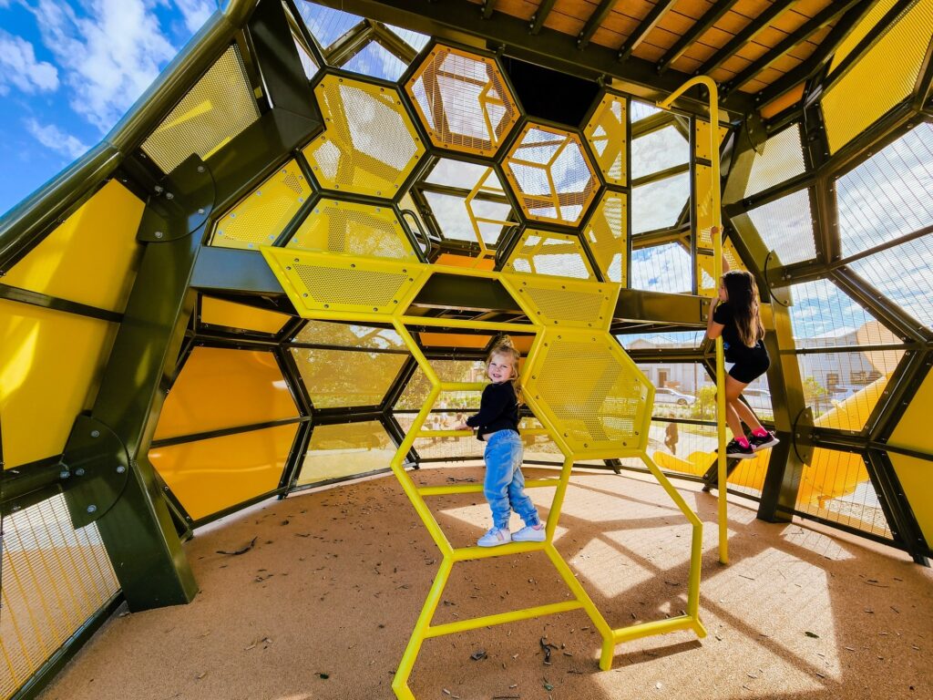 The first thing you notice is the huge yellow and black honeycomb tower rising out of the park. The bespoke honeycomb play structure is designed for confident climbers, roughly 4 years and up, with ladders and platforms leading kids up through the โhiveโ to a big, fast enclosed slide that twists them back down to ground level. Thereโs also a firemanโs pole for adventurous children whoโd rather zip down from the first level. Local students helped bring the tower to life with native flora and fauna artworks laser cut into the metal panels, which makes it as interesting to look at as it is to play on. The park also offers free Wi-Fi, a handy extra if you need to stay connected while the kids play.