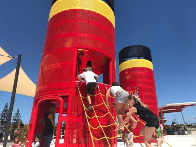 The first thing the kids will spot are the two huge bright red โfunnelsโ that tower over the main play area. These are linked by a rope bridge and surrounded by climbing nets, ladders and platforms, creating a bit of an adventure course for confident climbers. A long metal slide whooshes down from the structure, and from the higher platforms you get lovely views across Koombana Bay. This part of the Playground is definitely aimed more at older or more adventurous kids, and ours happily spent ages looping between the funnels, bridge and nets.
