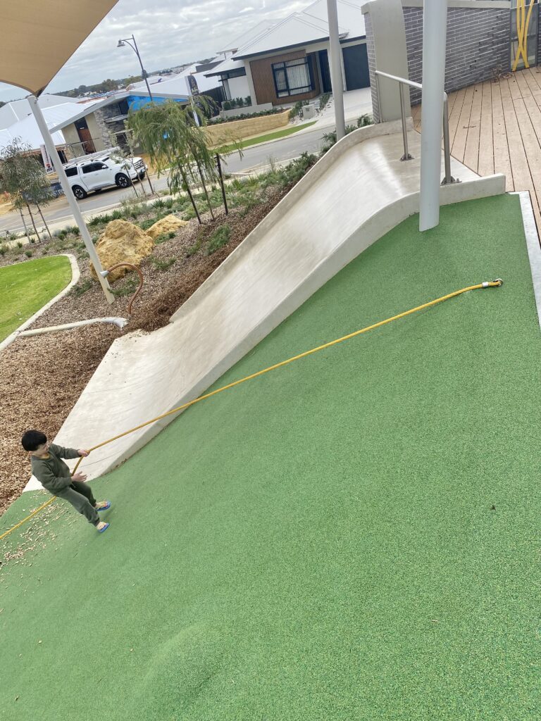 Now, letโs talk about that slide! The concrete drop slide shoots down the hill and is definitely a hit with little daredevils. Thereโs even a rope to help kids climb back up โ itโs steep but a whole lot of fun.