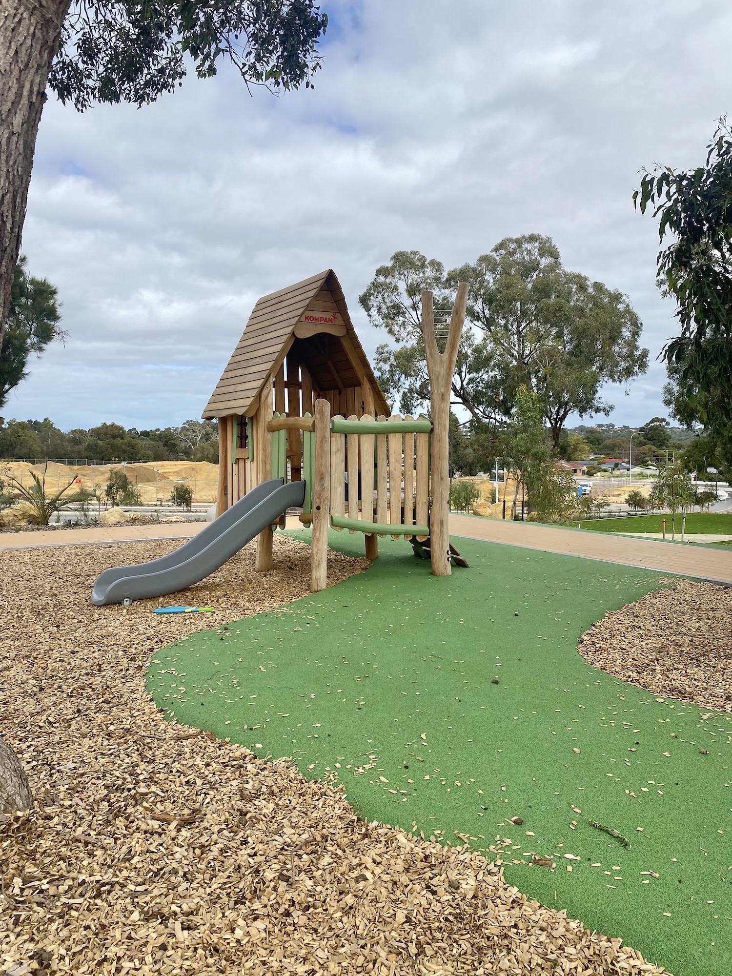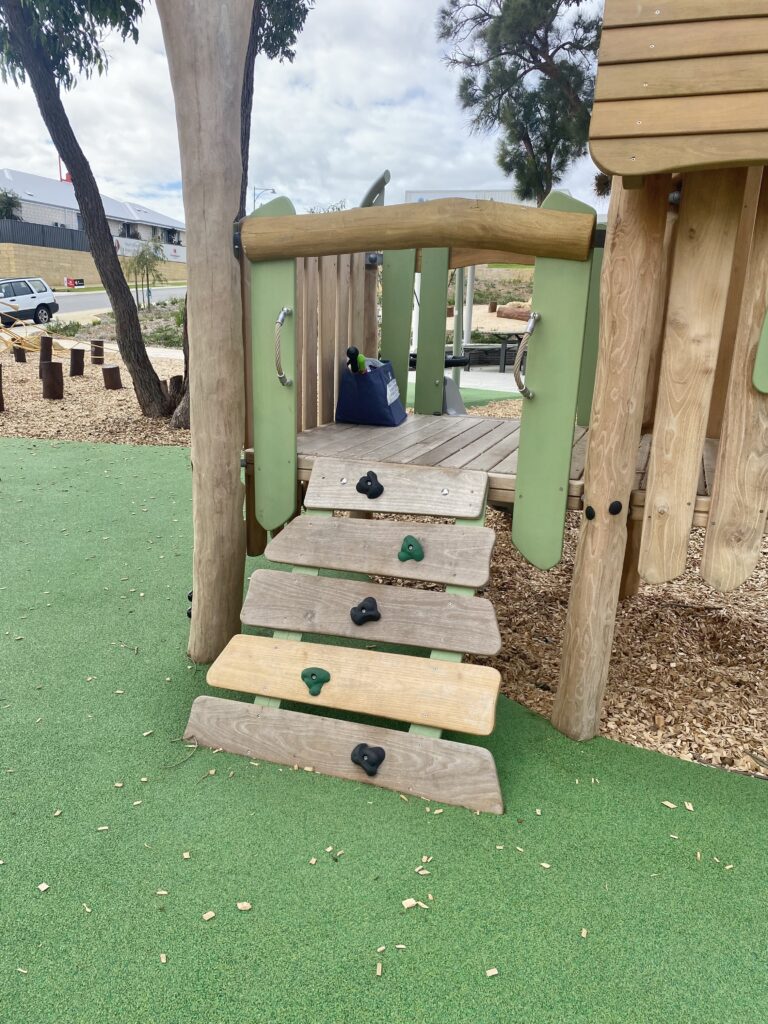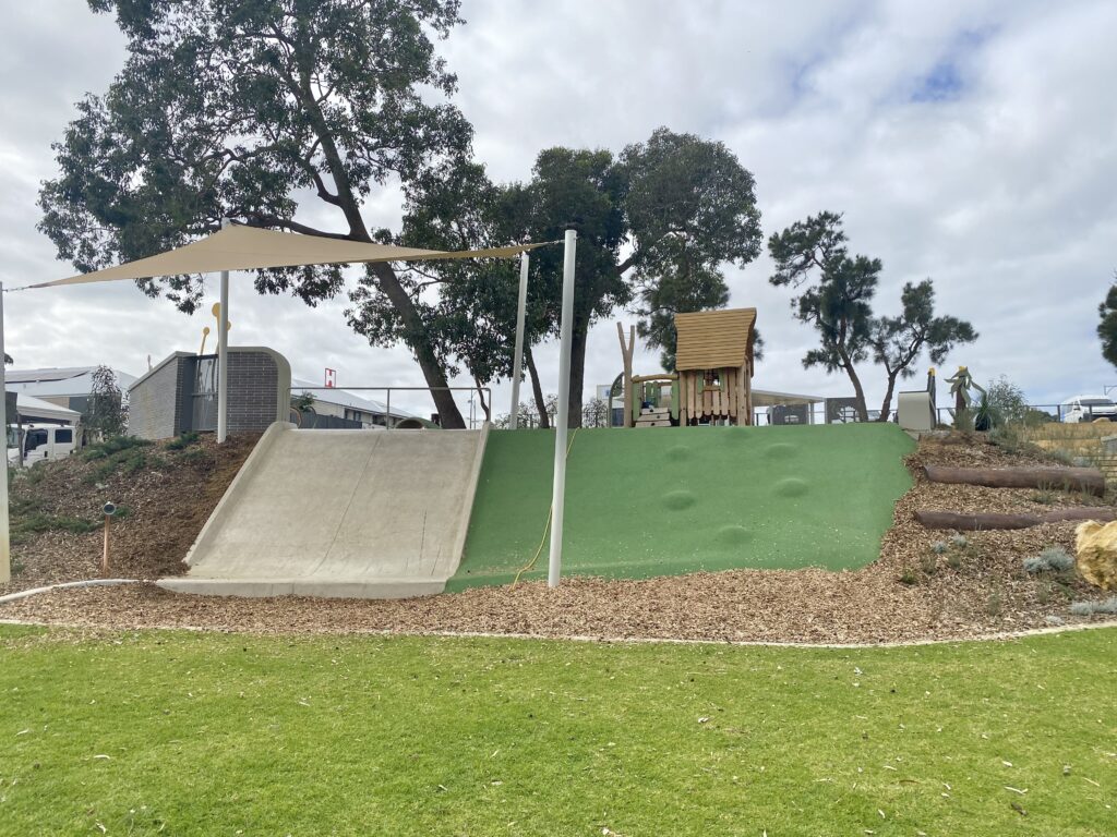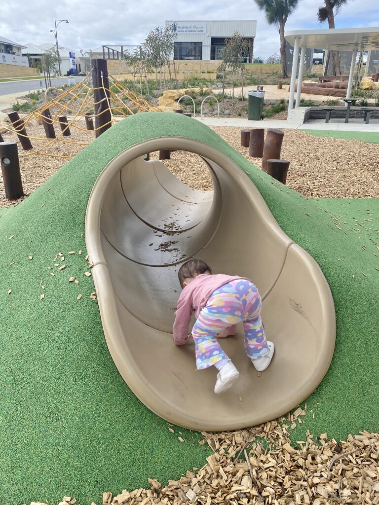 For the smaller ones, thereโs a toddler-friendly cubby house with a rock climbing wall and mini slide, plus a tunnel built into a grassy mini hill.