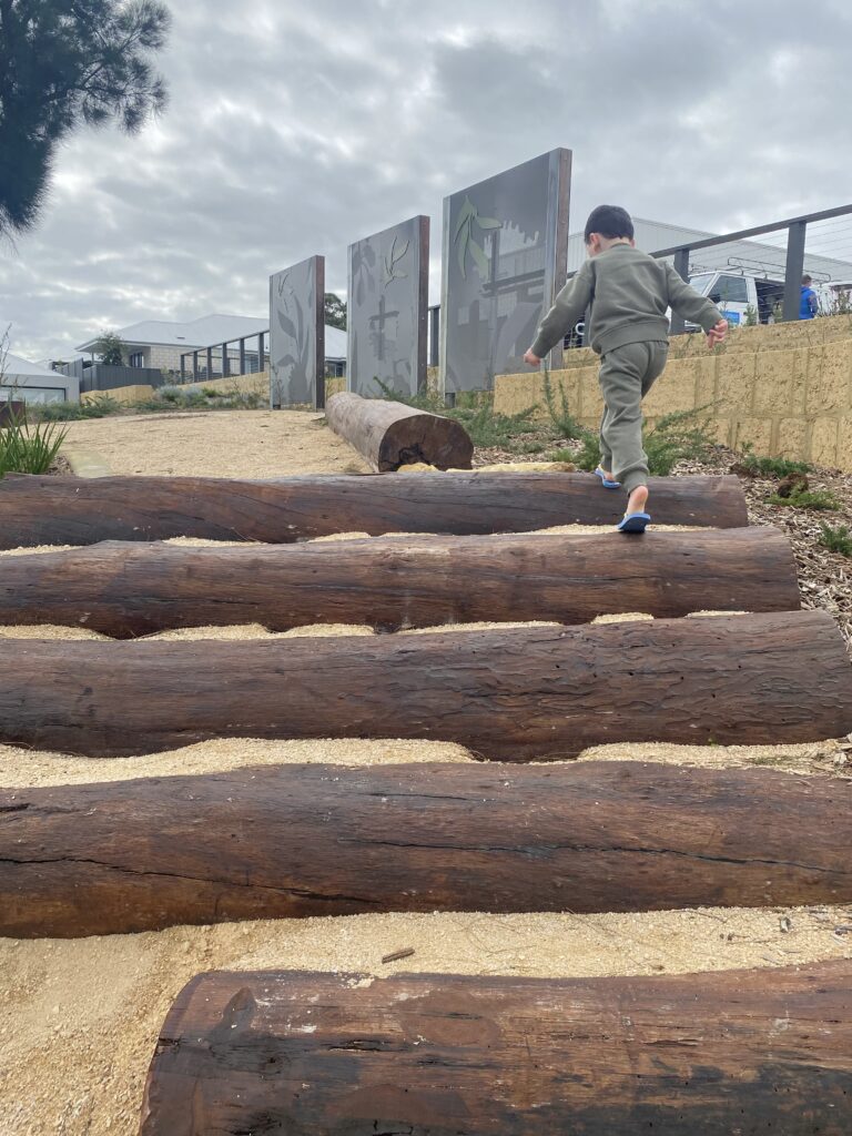 Balancing logs, wooden stepping poles, and soft fall surfacing