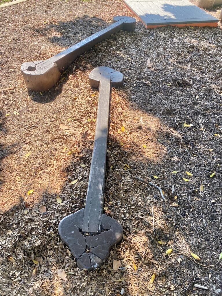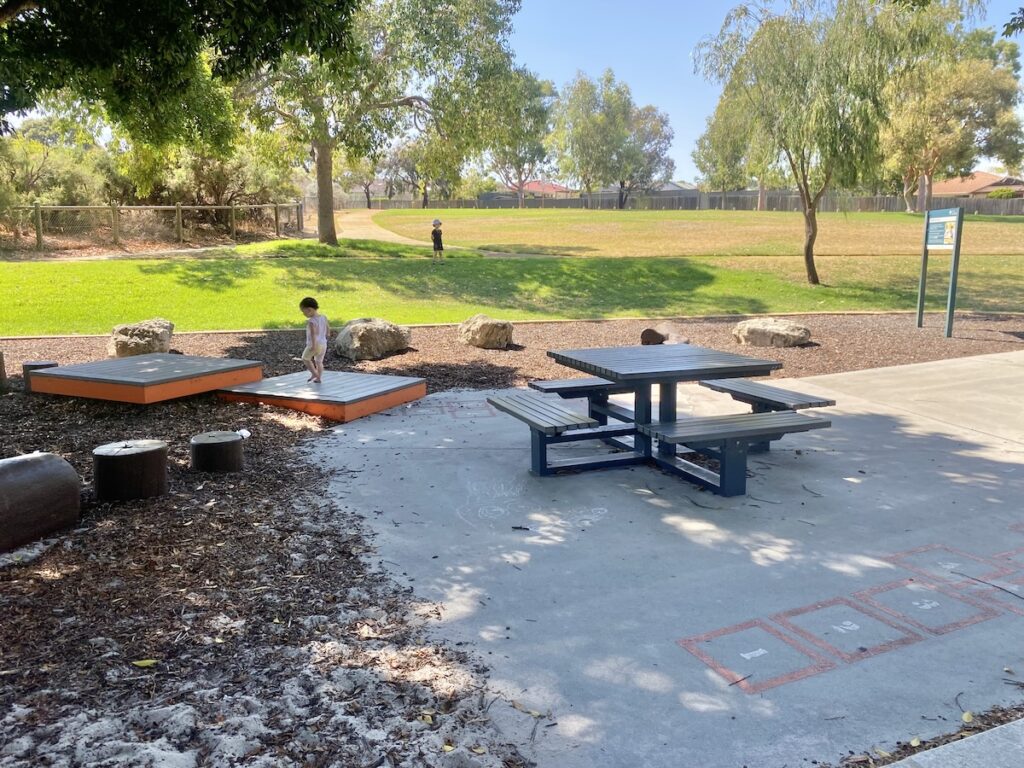 The ground surface is a mix of sand and mulch, which is soft underfoot and ideal for nature-inspired play. While there are no toilets in the park, there is a water fountain on site, which is very handy on hot days. A picnic table sits under the trees (without a built-in shade structure), offering a pleasant spot for morning tea or a quick snack break.