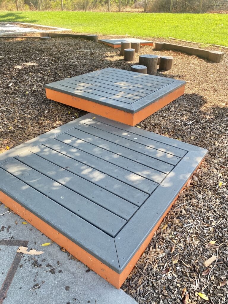The ground surface is a mix of sand and mulch, which is soft underfoot and ideal for nature-inspired play. While there are no toilets in the park, there is a water fountain on site, which is very handy on hot days. A picnic table sits under the trees (without a built-in shade structure), offering a pleasant spot for morning tea or a quick snack break.