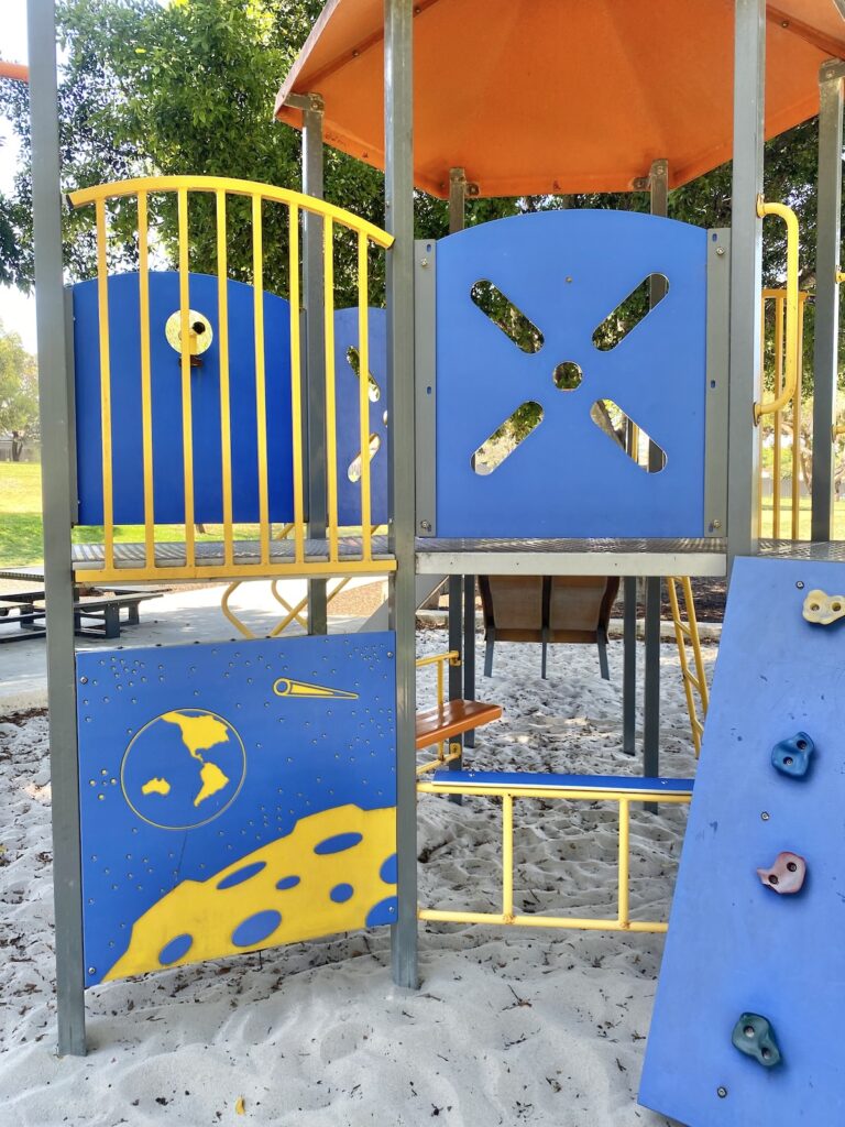 The main play structure is the star of the Playground and is sure to capture childrenโs imaginations. Blending space and pirate themes, it offers lots of different ways to climb, explore and play pretend. Kids can scale ladders and stairs, take on the rock-climbing wall, or challenge themselves on the rope wall.