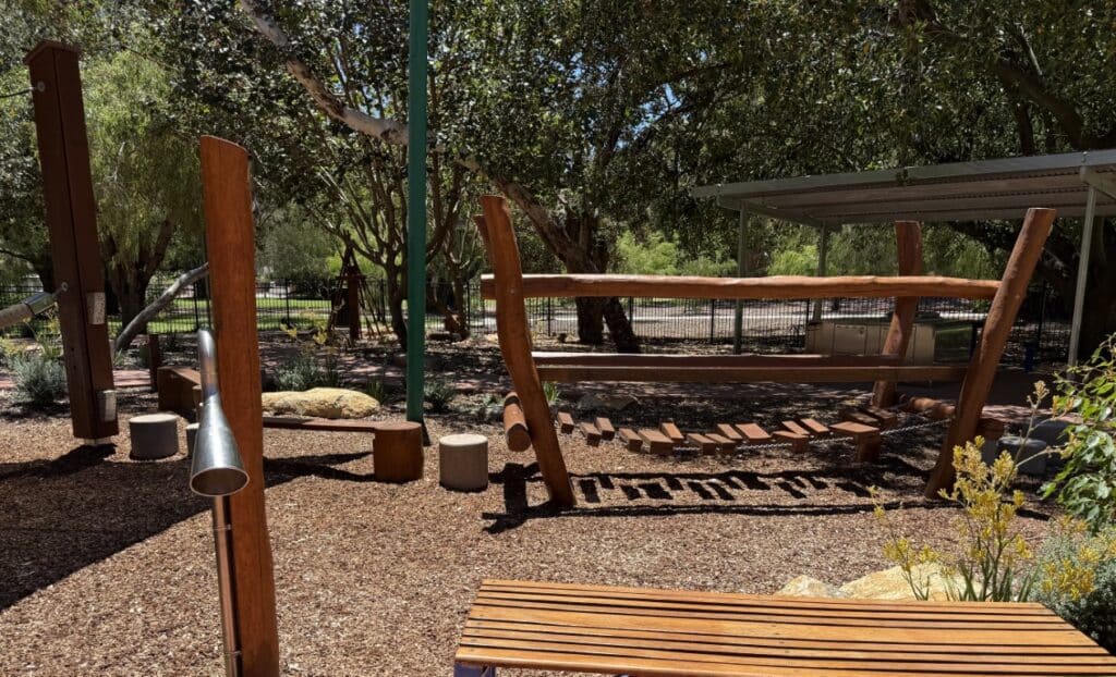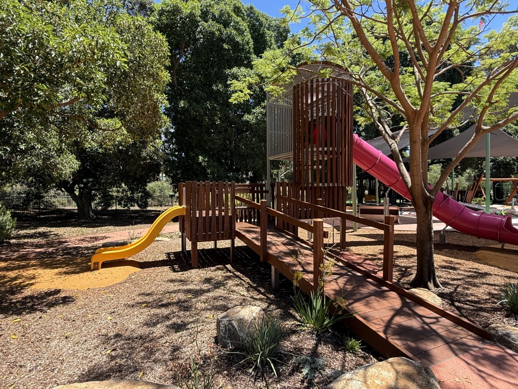With its mix of nature play, inclusive ramped structures, water and sand play, and more adventurous elements like the flying fox and balance course, Mueller Park Play Space is a well-rounded destination Playground in the heart of Subiaco. Itโs a great option for families with children of different ages who want a safe, enclosed space with plenty to do, plus extra sports facilities and open lawn just beyond the fence.